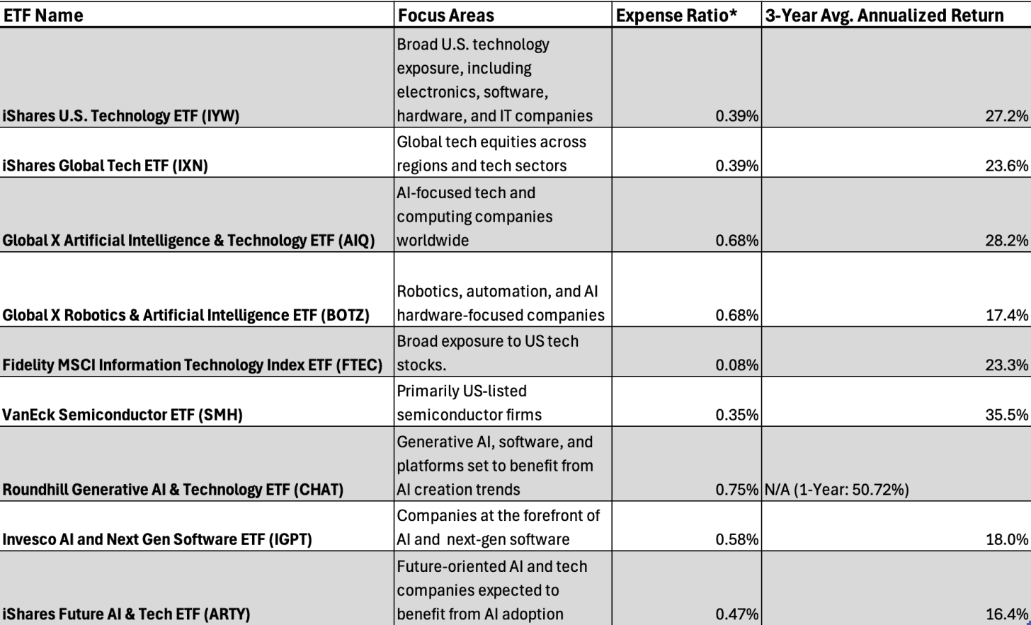 AI ETFs differ in focus. Some, like AIQ, spread across the full AI value chain. Others, like Roundhill Generative AI ETF (CHAT), zero in on generative AI. Broader funds like iShares U.S. Technology ETF (IYW) cast the net even wider across tech.