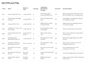 More advanced products include leveraged and inverse ETFs such as ProShares Ultra Bloomberg Crude Oil (UCO) and ProShares UltraShort Bloomberg Crude Oil (SCO), which aim to deliver double or inverse daily returns. These are designed for short-term trading and can diverge significantly from oil prices over longer periods due to daily compounding.