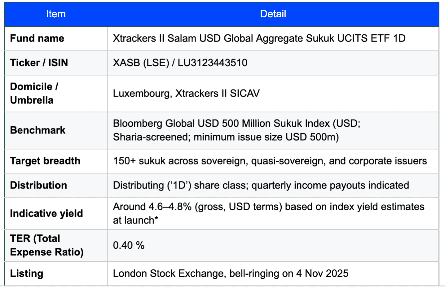 Dubai-based ASB Capital, in partnership with Xtrackers by DWS, has launched the Xtrackers II Salam USD Global Aggregate Sukuk UCITS ETF (ticker: XASB) on the London Stock Exchange (LSE). The fund tracks the Bloomberg Global USD 500 Million Sukuk Index, offering exposure to more than 150 USD-denominated sukuk in a single trade, with a total expense ratio (TER) of 0.40%. The listing was marked with an LSE bell-ringing ceremony on 4 November 2025.