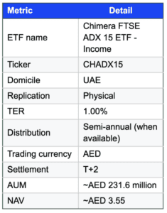 The Chimera FTSE ADX 15 ETF Income (CHADX15) offers investors a single-ticker gateway to the companies that sit at the heart of Abu Dhabi’s economic expansion. By tracking the FTSE ADX 15 Index, the ETF provides exposure to the exchange’s largest and most actively traded names, capturing the core of Abu Dhabi’s corporate leadership in a transparent, on-exchange structure.