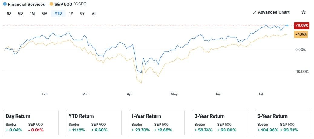 The third sector to outpace tech in 2025 (and perhaps the most quietly) is financial services, up 11.12% YTD.