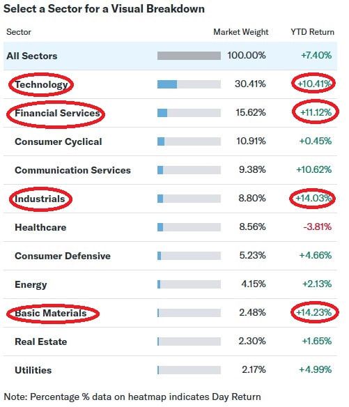 Let’s start with the surprise leader: basic materials. This sector is up 14.23% YTD, comfortably beating tech and every other major sector.