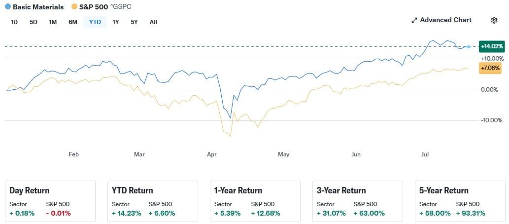 Basic materials’ rise is not out of nowhere. In 2025, the U.S. ramped up tariffs on steel and aluminum imports, doubling them to 50% for most countries. Copper is next in line, with a 50% rate set to kick in on August 1, 2025.