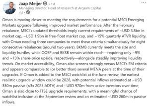 Importantly, Oman already scores well on market accessibility, including foreign ownership rules, settlement efficiency, and operational infrastructure factors that MSCI weighs heavily in classification decisions.