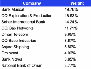 The MSCI Oman Index is concentrated, with its top three holdings accounting for more than half of total weight, and remains heavily tilted toward financials and energy-linked corporates.