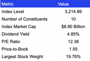 The index is relatively concentrated, with financials and energy-linked companies dominating overall weight.