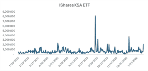 Saudi Arabia exposure saw a similar dynamic. The iShares MSCI Saudi Arabia ETF closed with roughly 2.021 million shares traded, well above its recent 20-day average near 780,000 shares. Although the fund did not mark a new 52-week high, the magnitude and concentration of trading into the close point to systematic repositioning rather than discretionary momentum alone. Rebalance events often trigger simultaneous inflows and outflows as managers recalibrate exposures, amplifying volume across both primary ETFs and underlying local shares.