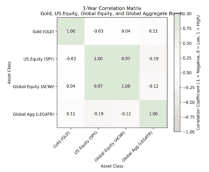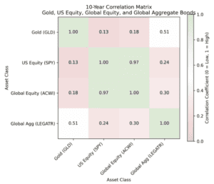 Gold maintains low long-term correlations with equities, supporting stable diversification characteristics.
