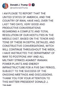 In a statement released on March 23, Trump said the United States and Iran had engaged in “very good and productive conversations” and indicated that planned military strikes on Iranian infrastructure would be postponed for five days. The tone suggested a possible de-escalation path, offering markets a rare moment of relief after weeks of rising geopolitical tension.