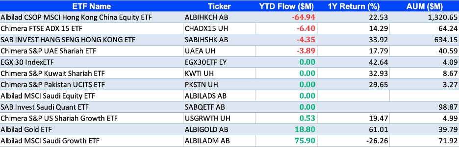 - Chimera S&P UAE Shariah ETF -$3.9M outflow, reflecting tactical adjustments.