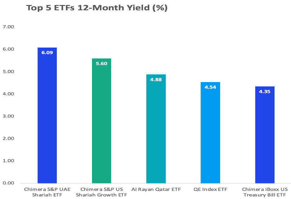 Chimera S&P US Shariah Growth ETF (5.60%) accesses dividend-paying US large-caps screened for Shariah compliance, while QE Index ETF (4.54%) tracks Qatar’s benchmark index.