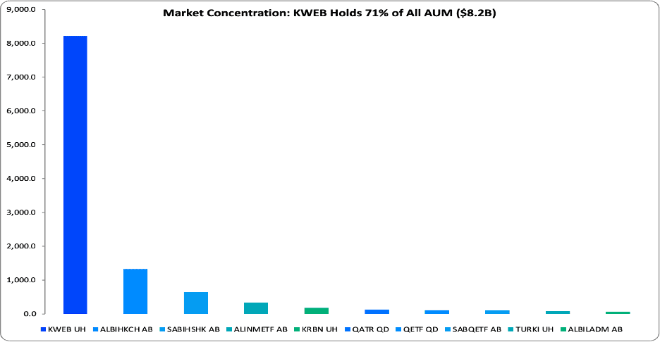 The two largest locally-listed products Albilad CSOP MSCI Hong Kong China Equity ETF ($1.32B AUM, +25.8%) and SAB Invest Hang Seng Hong Kong ETF ($645M AUM, +36.3%) are strategic holdings, embedded in long-term portfolios as core China exposure without the operational complexity of offshore accounts or direct A-share access. The December cross-listing of KWEB, the world’s largest China internet ETF with $8.2B in global assets, further validates this structural preference by offering direct access to Alibaba, Tencent, JD.com, and Meituan, China’s digital infrastructure giants through familiar ADX trading mechanics.