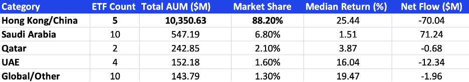 Saudi, UAE, and Qatar equity exposures combined account for $942M in AUM, representing 30.1% of the total market. While this is a respectable share, it remains dwarfed by international exposures, reflecting a persistent reality: the ETF wrapper has not yet catalyzed material domestic equity allocations at scale. Instead, the industry functions largely as a conduit for international diversification, with local beta playing a supporting role.