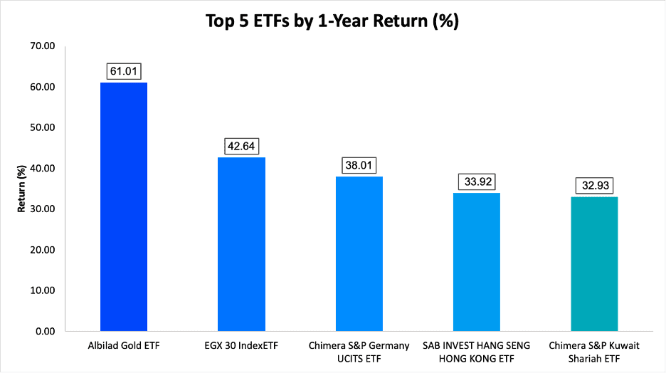 - EGX 30 IndexETF (Egypt): +42.6%, $4.1M AUM. Egypt’s equity market benefited from renewed foreign interest, currency stabilization, and structural reforms that improved investor sentiment.
