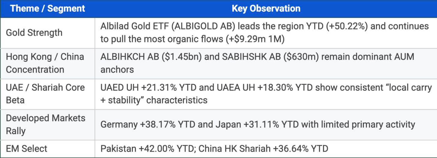 Locally, UAE equity ETFs delivered another month of resilience, supported by stable earnings trends, ongoing structural improvements in liquidity, and strong corporate action pipelines. Shariah filters continue to play a structural role in the region not only as a religious preference variable, but increasingly as a practical quality filter, which tightens universes and reduces unintended factor drift. Despite that, primary creations across the region were quiet, suggesting price action was driven more by secondary market activity than by strategic allocation shifts in October.